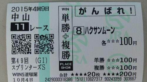 こんにちは(^-^) 外向けブログです(-_-;)スプリンターズS(G1) 結果・払戻 | 2015年10月4日 中山11R レース情報(JRA) - netkeiba.com収支云々は今回度外視です。 ただただ 高松宮記念2着記念?くるくる旋回馬ハクサンムーン馬場入り3戦分 - 気紛れ詩歌いの…